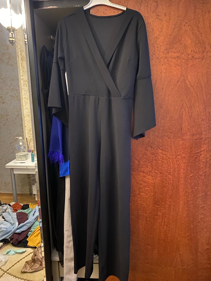 Siyah uzun kollu tulum, yakasında kesimli drapeli detaylar ve yumuşak sentetik kumaş ile ofis ve sokak stiline uygundur.
