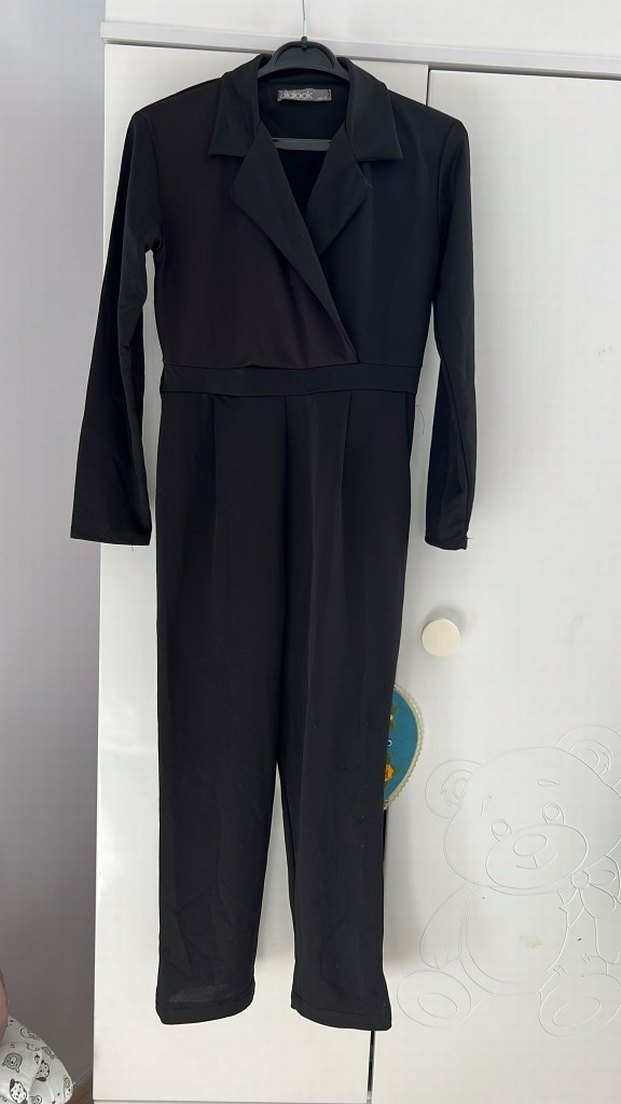 Siyah uzun kollu tulum, kesik yaka ve kemerli bel detayıyla, düz sentetik kumaştan üretilmiştir. Ofis ve sokak stili için uygundur.