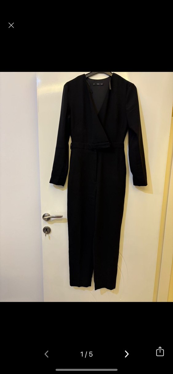 Siyah renkli, uzun kollu, kemerli ve kesimli yakalı tulum. Rahat kalıp ve uzun boy, yumuşak ve sıcak kumaştan, ofis için klasik şıklıkta.