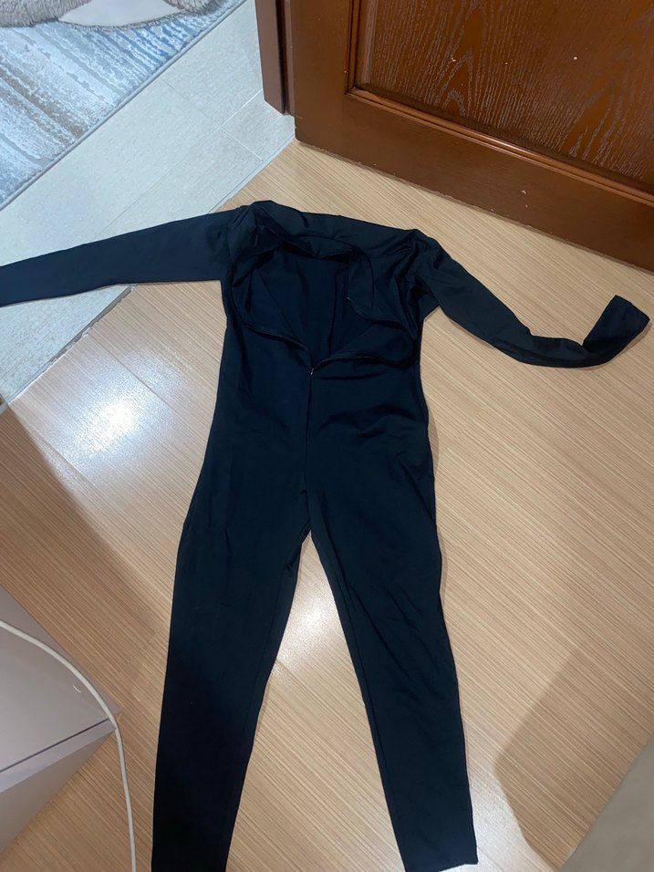 Yüksek yakalı ve uzun kollu, siyah ve vücuda oturan bu tulum, yumuşak sentetik kumaştan yapılmıştır. Günlük kullanım için rahat ve şık bir sokak stili sunar.