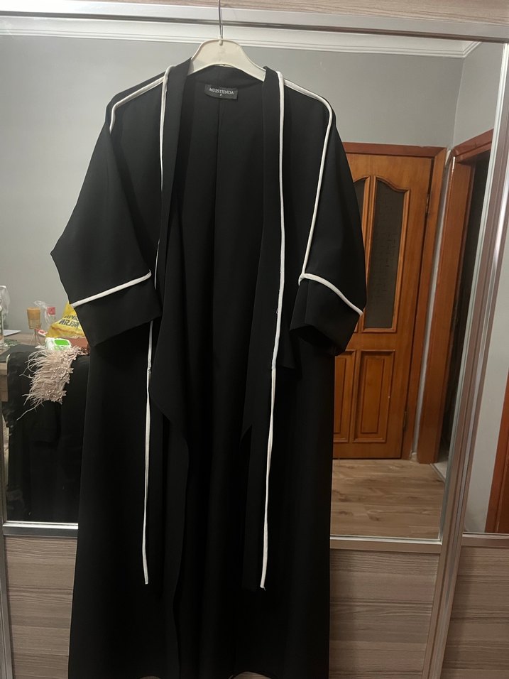 Kadın siyah uzun kollu, uzun boy hırka. Minimalist tarzda, kenarlarında beyaz ince detaylar bulunur. Rahat ve sade bir görünüme sahiptir.