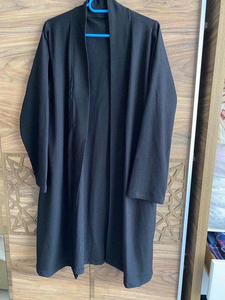 Kadınlar için uzun boy, düz siyah renkte, uzun kollu ve sade minimalist tarzda rahat kesim hırka. Boy 95 iki koltuk arasi 60 cm esnek saglam kumas