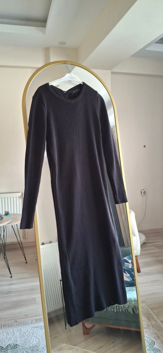 Bu siyah uzun elbise, uzun kollu ve bisiklet yaka detaylıdır. Düz ve hafif sentetik kumaştan üretilmiş, günlük şıklık için uygundur.