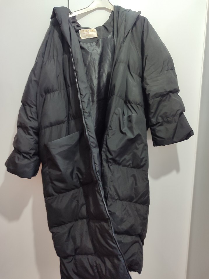 Siyah, uzun kollu, fermuarlı, gevşek kesim, çıt detaylı uzun kış montu. Yumuşak ve sıcak kumaştan, rahat sokak stili için uygun.