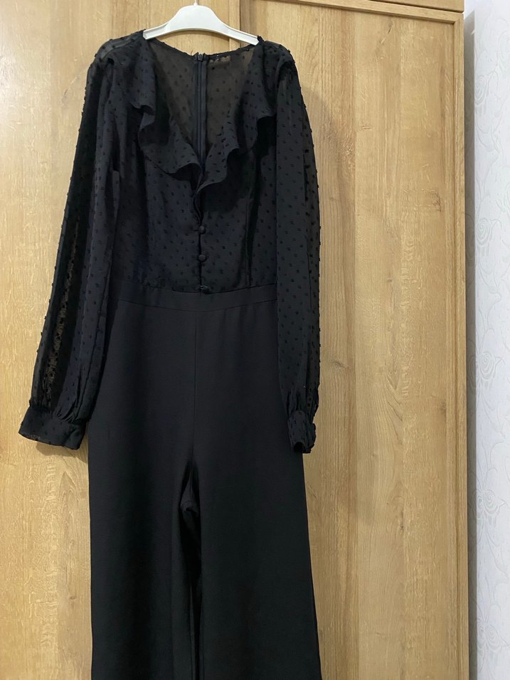 Kadın siyah uzun kollu, V yaka ve fırfır detaylı uzun kombinezon. Sentetik kumaştan, klasik ve şık ofis tarzına uygundur.