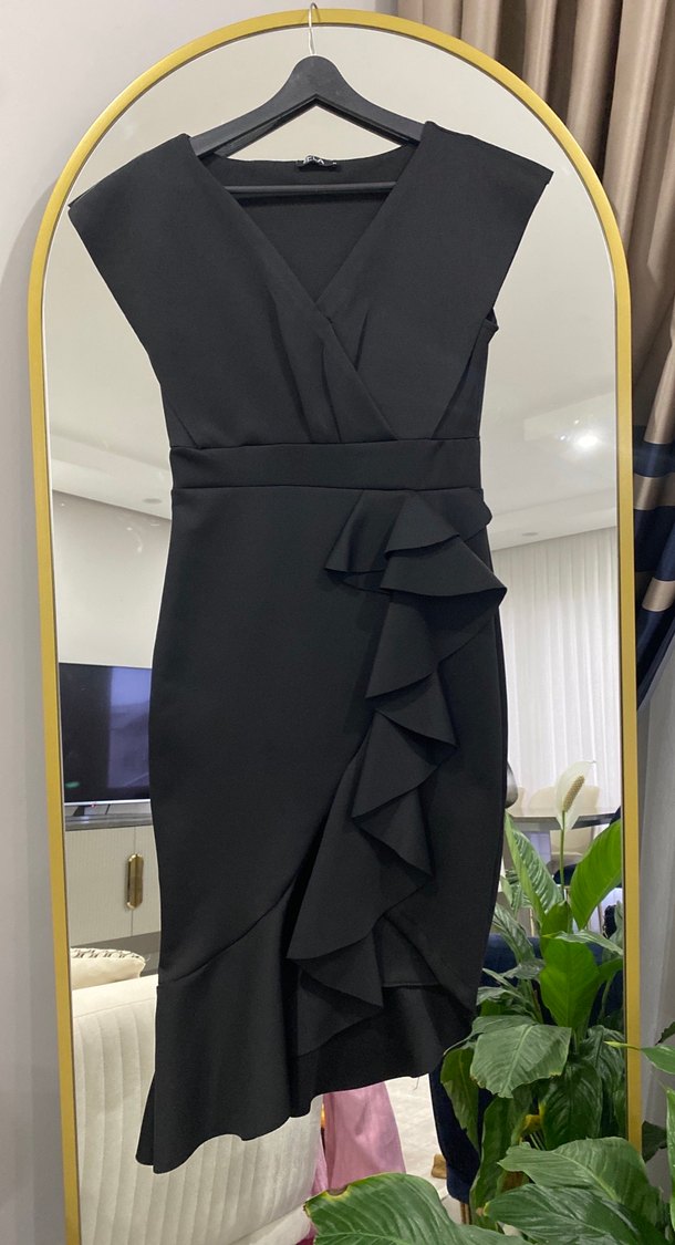 Kadın Siyah Uzun Kollu V Yaka Fırfırlı Elbise