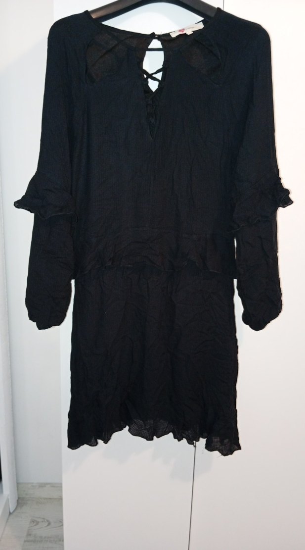 Siyah keten kumaştan, uzun kollu ve V yaka detaylı, fırfır süslemeli bol kesim gotik stil elbise. Romantik akşamlar için uygun. içi astarlı