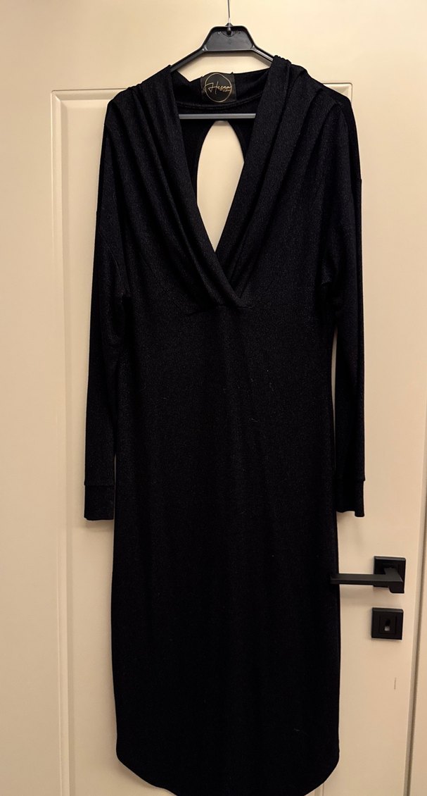 Siyah, uzun kollu, drapeli V yaka triko elbise. İnce ve uzun kesimiyle ofis için uygun, gotik tarzda şık bir seçim.