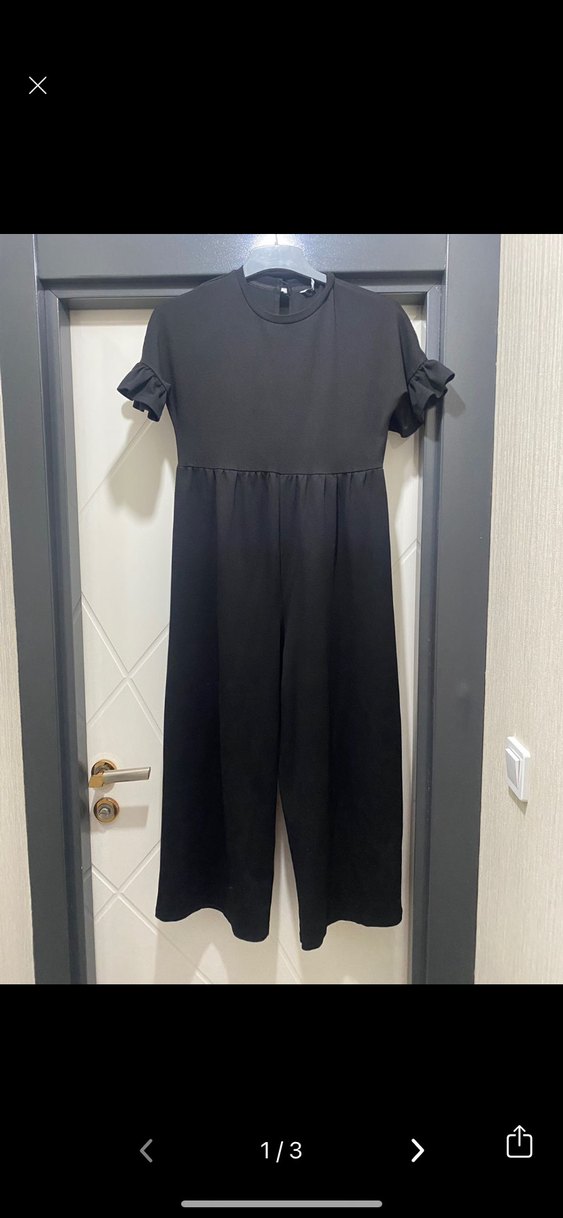 Siyah uzun tulum, kısa volanlı kollar ve yuvarlak yakaya sahip, yumuşak sentetik kumaştan üretilmiş, rahat ve bol kesimdir. Günlük kullanıma uygundur. ✨