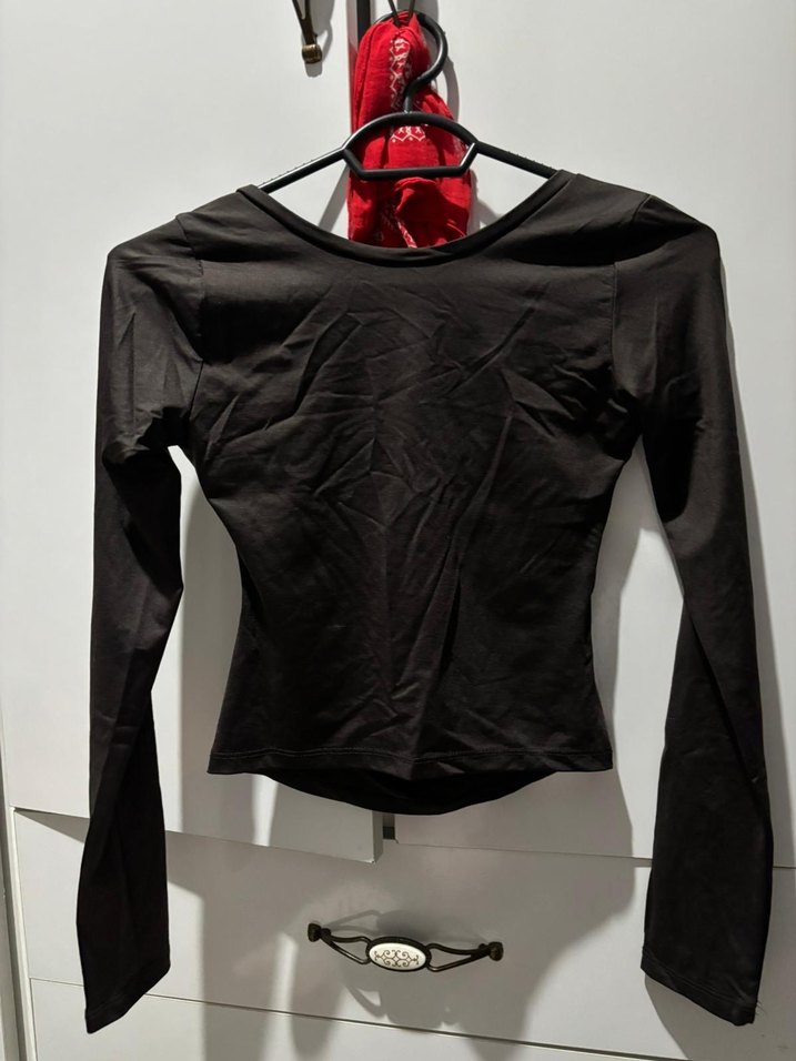 Uzun kollu, yuvarlak yakalı ve vücuda oturan siyah bluz, yumuşak sentetik kumaştan üretilmiştir. Desensiz tasarımı günlük kullanıma şık bir dokunuş katar.
