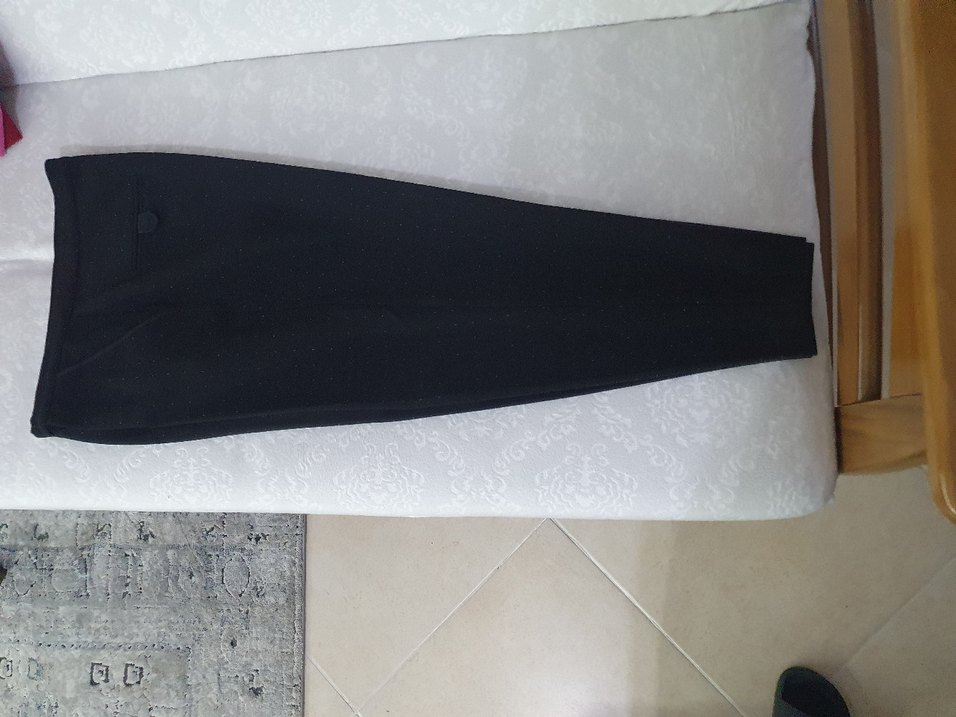 Kadın siyah likralı kumaş pantolon, dar paca. Sentetik kumaştan, minimalist ve goth tarzına uygun, dış mekan kullanımı için ideal. 46 beden bel genişliği 91 CM.