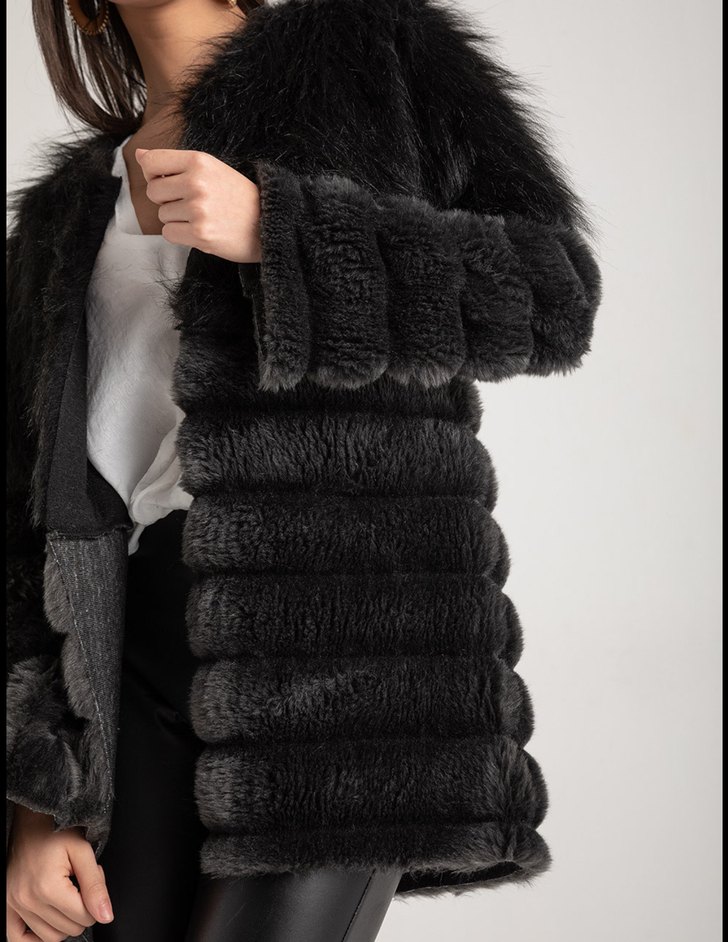Kadın Siyah Uzun Kürk Detaylı Mont