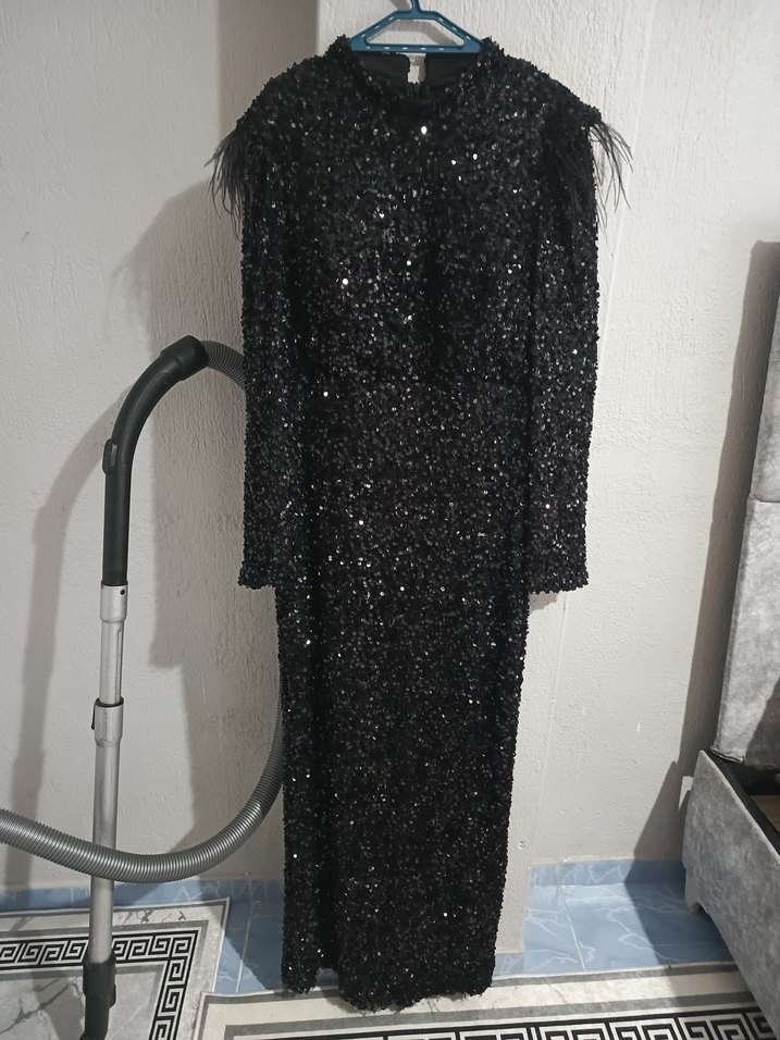 Kadın Siyah Uzun Kürklü Abiye Elbise 42 44 uyumlu