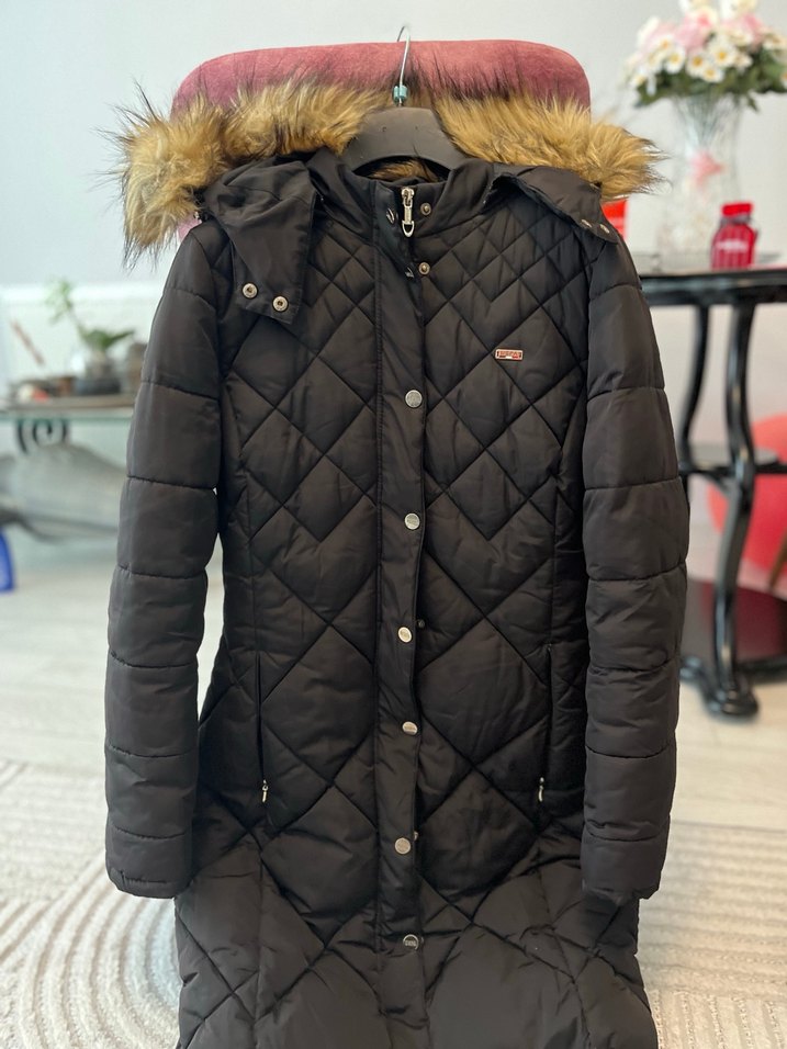 Kadınlar için uzun, regular fit kesimde, kürklü kapüşonlu ve yumuşak, sıcak tutan fleece kumaştan yapılmış kışlık siyah mont. Sokak stiline uygun rahat bir parça. ❄️