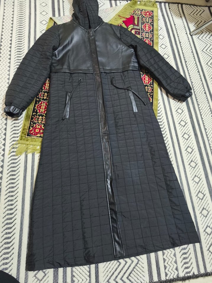 Kadınlar için siyah uzun kaban, kuşaklı ve askılı kollu. Notlu yaka ve regular kesimle sokak modasını rahatlıkla birleştirir. Sentetik kumaştan, günlük kullanıma uygun. ürün sadece 1 kez deneme amaçlı giyildi. zümra tesettür mağazasından alınmıştır.