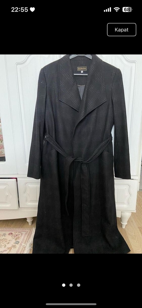 Kadınlar için uzun, kuşaklı, yakası kesik klasik kesimde siyah kaban. İpeksi dokusu ve uzun kollarıyla