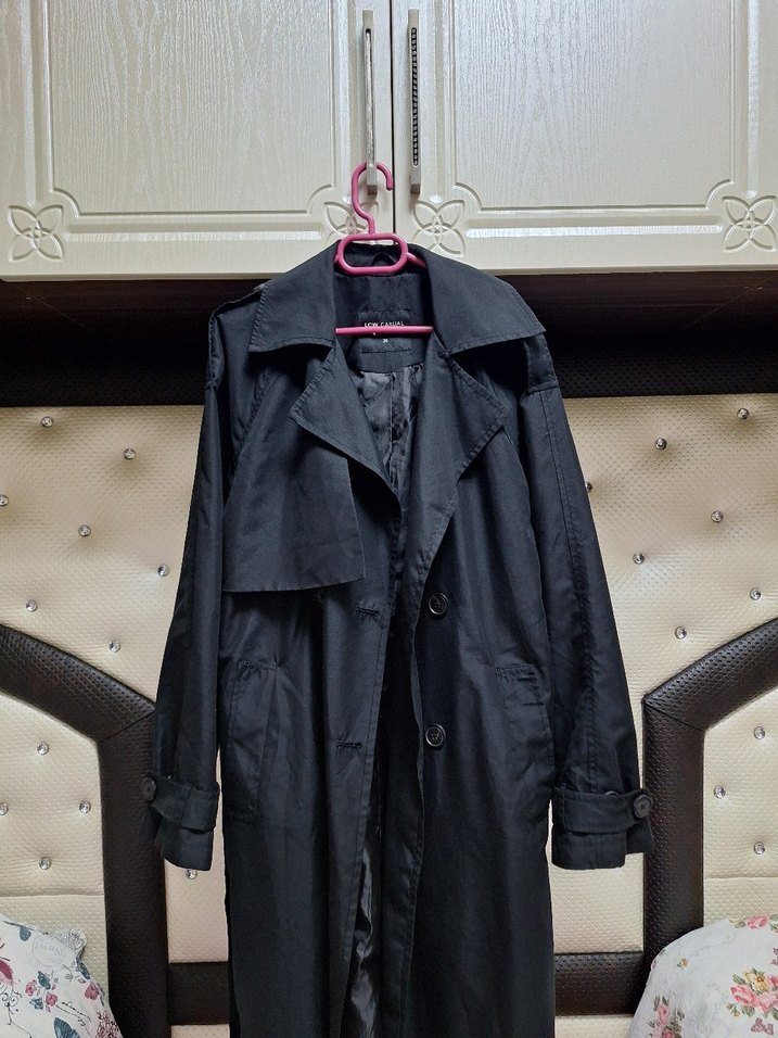 Teklif yapabilirsiniz. Notlu yakalı, kuşaklı siyah uzun trençkot. Gevşek kesim ve askılı kollara sahip, sentetik kumaştan günlük rahat kullanım için.