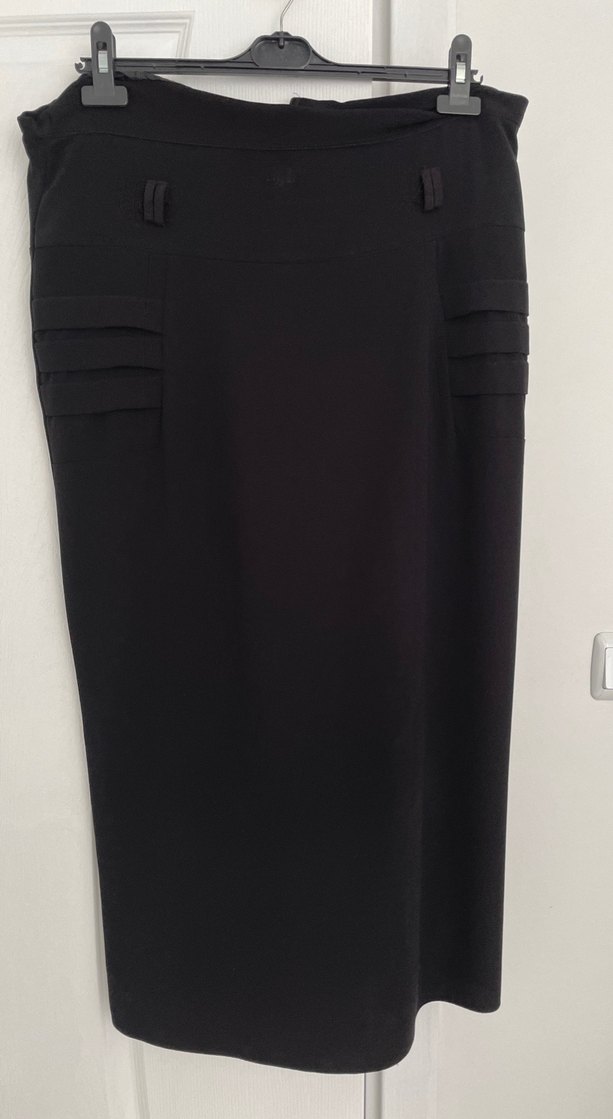 Siyah uzun etek, düz kesim ve yumuşak sentetik kumaştan, ofis için gotik tarzda şık bir seçenek.