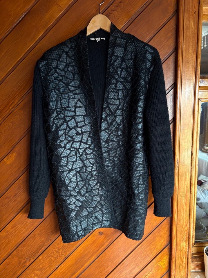 Kadınlar için uzun kesim, yakalı ve ön kısmı örgü desenli hırka. Uzun kollu ve düzenli kesim, ofis için şık siyah goth tarzı. Beden olarak s yazıyor fakat ben L beden olmama rağmen çok rahat giyiniyorum bol kalıp.