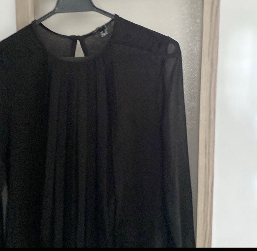Kadın siyah bluz pilili detaylara, uzun kollara ve yuvarlak yakaya sahiptir. Gevşek kesim ve ipeksi dokusu ile gotik ofis stiline uygundur.
