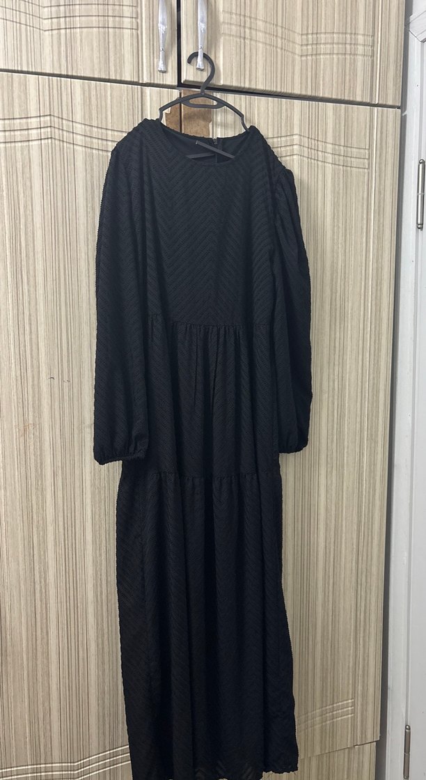 Siyah uzun elbise, pilili detaylara ve yüksek yakaya sahiptir. Uzun kollu ve bol kesim olup, yumuşak sentetik kumaştan üretilmiştir.