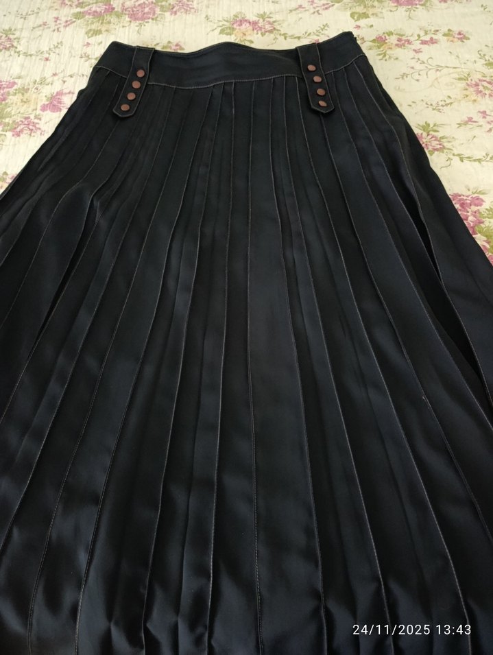 Siyah uzun pilili etek, ipeksi dokusu ve gotik tarzıyla düzenli kesime sahip, ofis kullanımı için uygundur. göründüğü gibi temiz iç astarında sökülme var o da giymemi engel değil yine belirtmek istedim