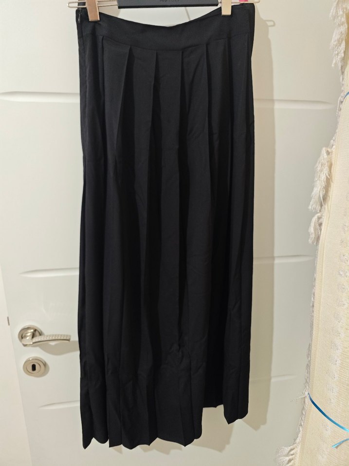 Siyah uzun keten etek, pilili ve regular fit kesimlidir. Gotik tarzıyla ofis kullanımına uygundur.