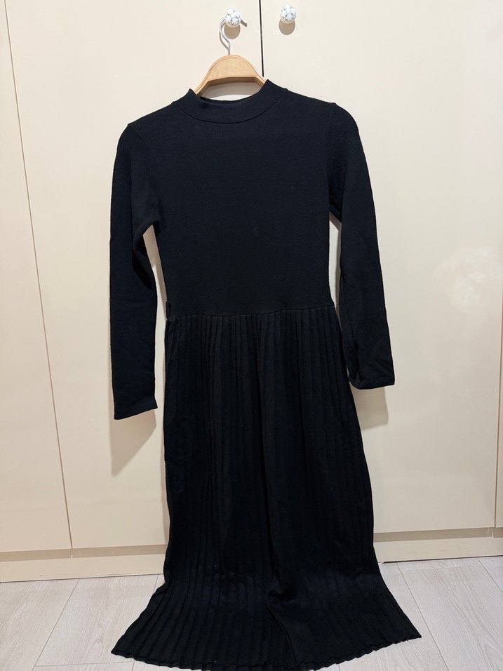 Siyah uzun elbise, yüksek yakalı ve uzun kollu olup, belden oturan kesimi ve piliseli eteği vardır. Yumuşak sentetik kumaştan yapılmıştır, minimalist ve normcore tarzlara uygundur.