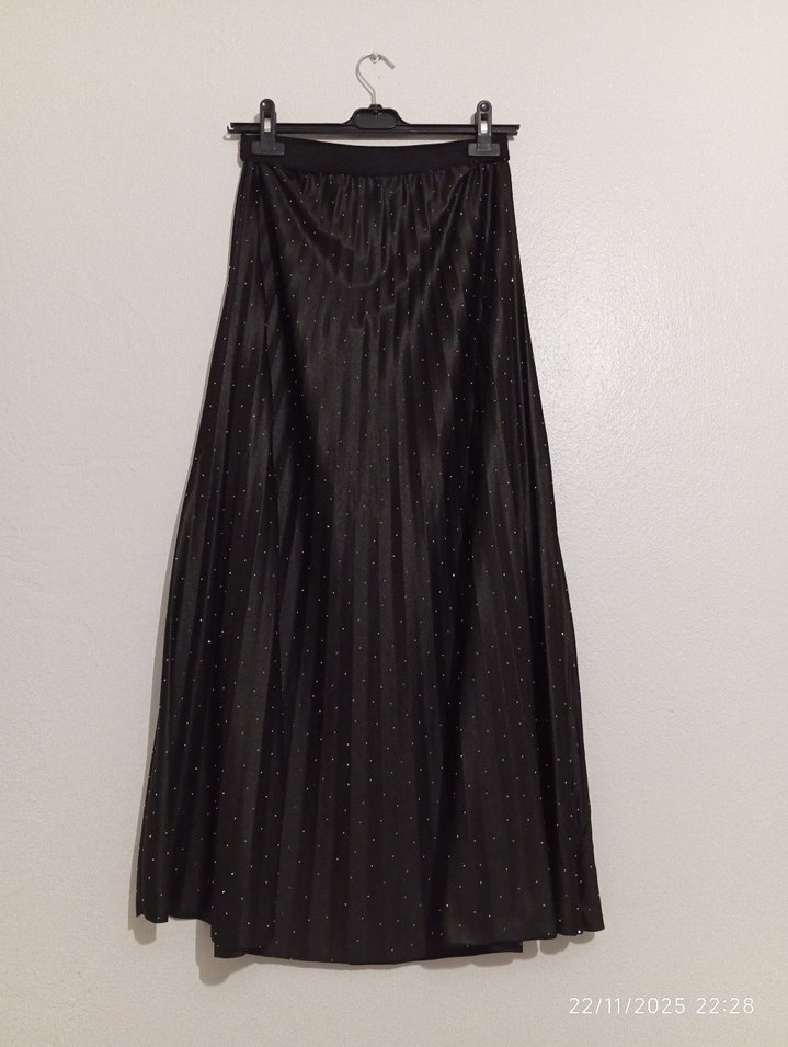 Siyah uzun piliseli etek, sentetik kumaştan, bol kesimlidir. 2 3 kere giyilmiştir beli lastiklidir