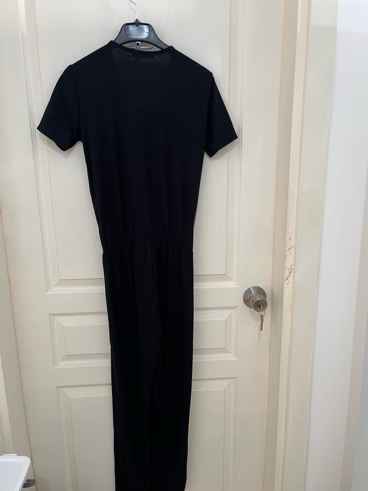 Siyah uzun tulum fitted kesim V yaka ve kısa kolludur. Piliseli detayları ve sentetik kumaşıyla günlük kullanıma uygundur.