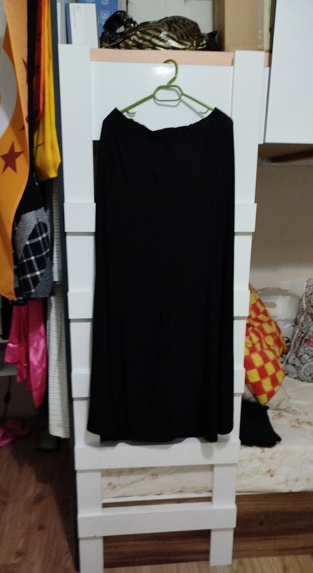 Siyah renkte, sentetik kumaştan yapılmış, uzun ve salaş kesimli drapeli kadın eteği. Minimalist ve gotik tarzda, desensiz, günlük kullanıma uygundur.
