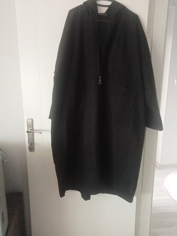 Siyah uzun, salaş kesim kadın kabanı, drapeli tasarımı ve kesik yakasıyla dikkat çeker. Yumuşak ve sıcak kumaştan, uzun kolludur, günlük kullanıma uygundur.