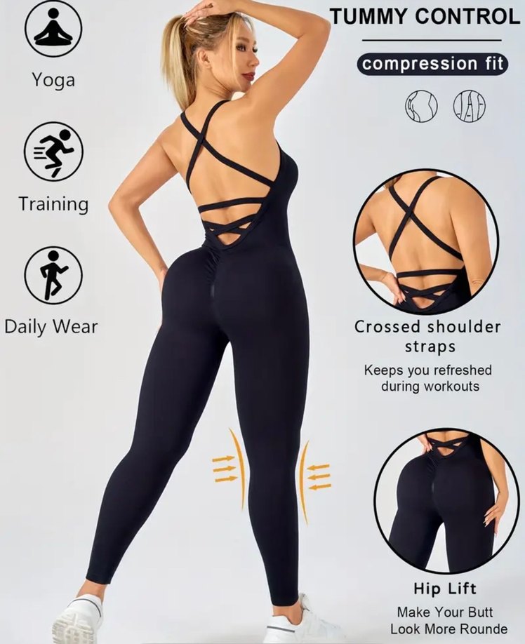 Siyah, uzun boylu, sırt çapraz askılı, karın kontrolü sağlayan sıkıştırıcı kumaşlı kadın spor tulumu. Yoga ve antrenman için elastik ve kalça kaldırıcı destekli.