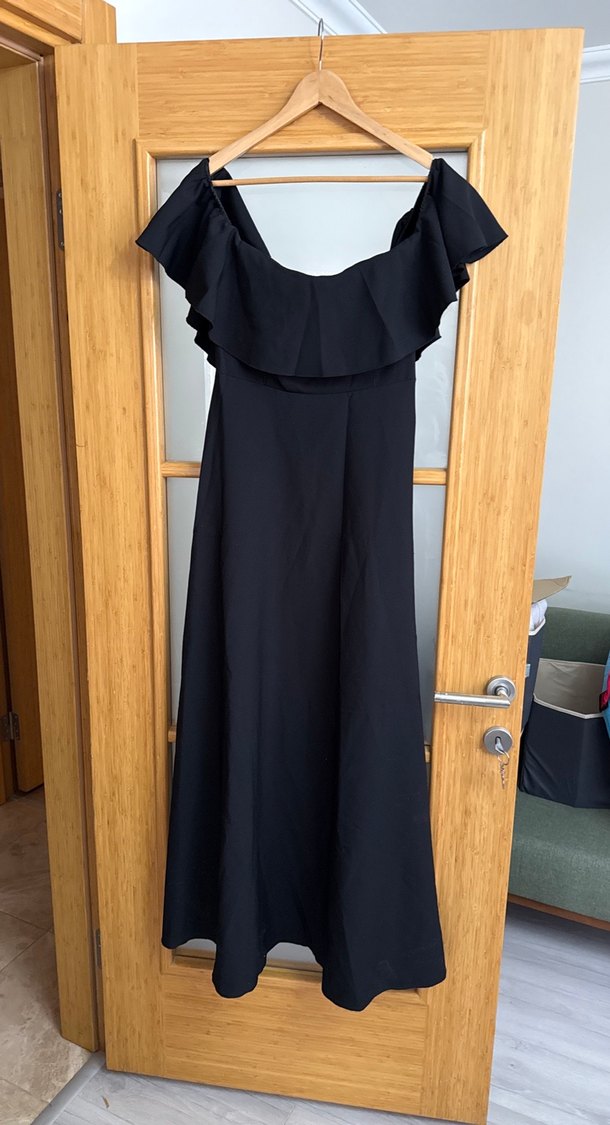 Siyah uzun straplez elbise, fırfırlı detaylı, salaş kesim ve kolsuzdur. İpek gibi kumaştan, gotik ve Paris esintili, romantik akşamlar için uygundur.