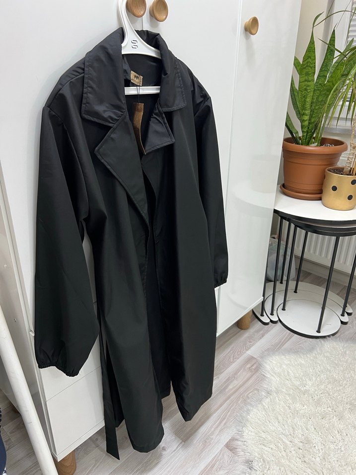 Düz siyah, uzun kol ve kemerli, regular fit uzun trençkot. Notch yakalı, minimalist sokak stili için uygun.