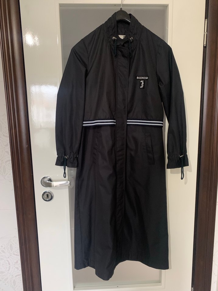 Siyah uzun trençkot, kemerli bel ve kesik yaka detayına sahiptir. Uzun kollu, sentetik kumaştan yapılmış, rahat kesimdir. Günlük kullanıma uygundur. Birkaç kez kullandım yeni sayılır iki kol arası 52 uzunluk 114