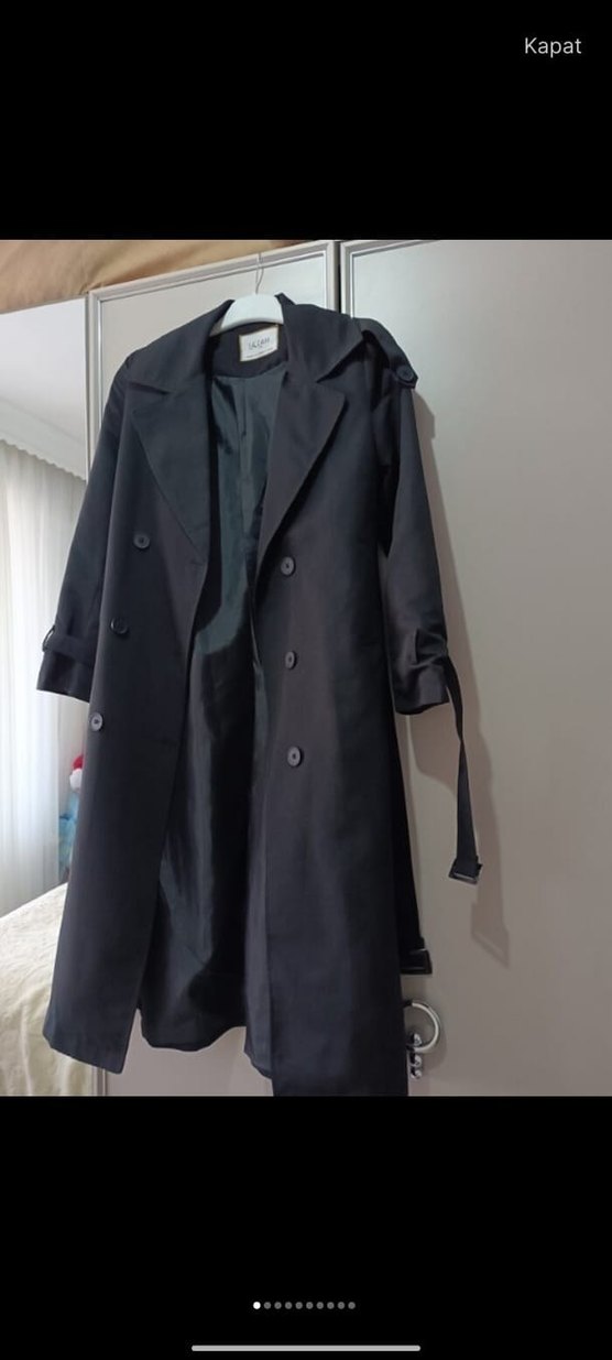 Siyah uzun trençkot, kesimli yaka ve düğmeli ön kısmıyla dikkat çeker. Uzun kollu, regular fit ve sentetik kumaştan üretilmiştir. yeni birkaç kez tek kullanıldı çok iyi durumda defosu yok boyu :1.35 kol boyu . 55
