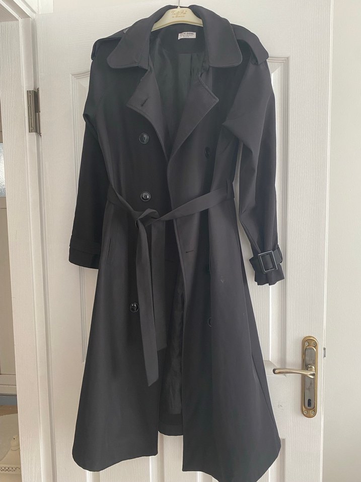 Siyah uzun trençkot, yakalı ve kemerli tasarımıyla sentetik kumaştan üretilmiştir. Uzun kollu ve regular fit kesimlidir, şık goth tarzı için uygundur. Bir cebi sökük