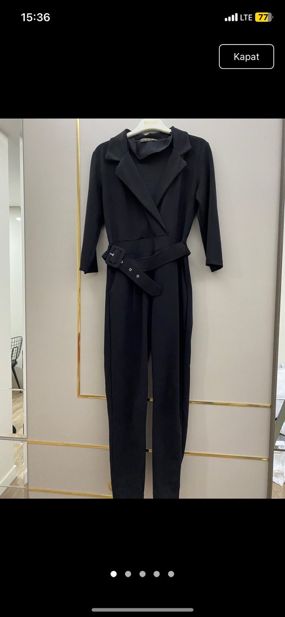Siyah uzun tulum, yakalı, askılı kollu ve kemerli, ofis için şık ve rahat bir tercihtir. Regular fit ve sentetik kumaştan üretilmiştir.
