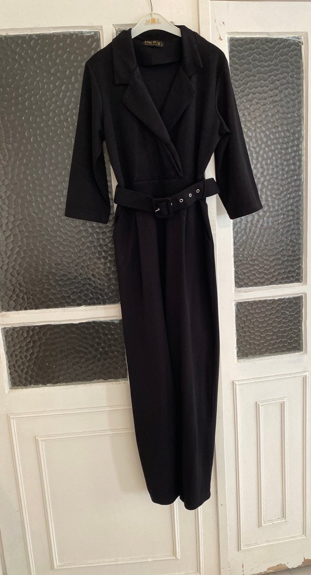 Kadın Siyah Uzun Tulum, Kemerli, Notched Yaka