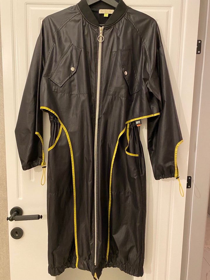 Siyah uzun yağmurluk, bol kesim, uzun kollu ve fermuarlı ön tasarıma sahiptir. Notlu yaka ve baskılı detaylar, sarı şeritlerle sokak modası havası verir.