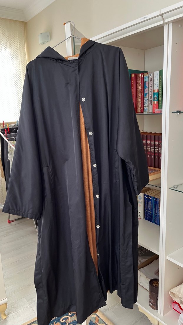 Bu kadın siyah yağmurluk, uzun boy ve bol kesimle drapeli tasarıma sahiptir. Notlu yaka ve uzun kolludur, sentetik kumaştan ofis kullanımı için uygundur. ️