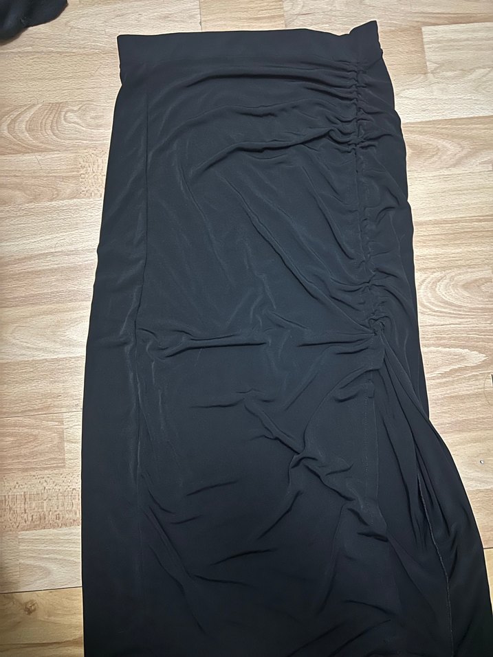 Siyah uzun etek, fitted kesim ve drapeli detaylara sahip, yumuşak sentetik kumaştan üretilmiştir. Minimalist ve goth tarzına uygun, dış mekan kullanımı için idealdir.