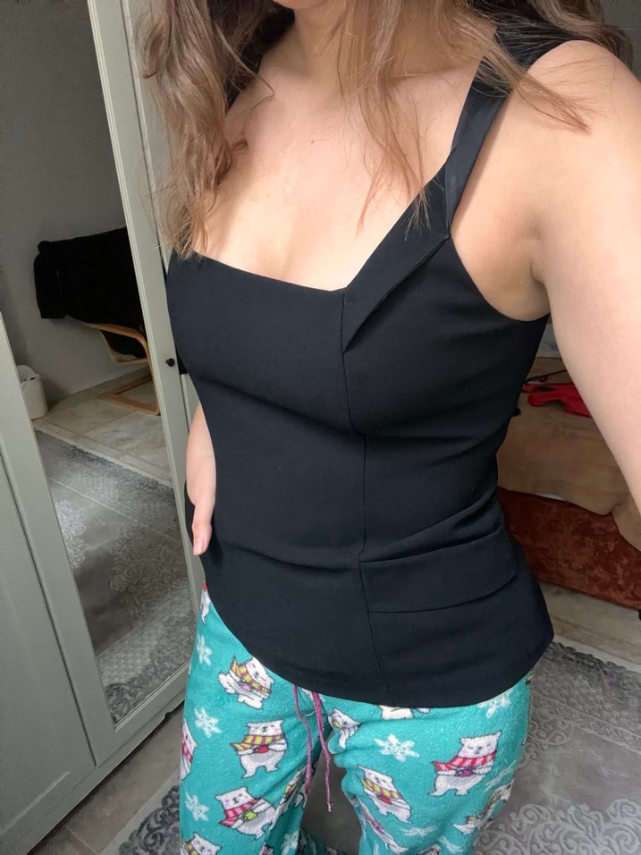 V yaka ve askılı, cep detaylı siyah, vücuda oturan bluz.Sentetik kumaştan, günlük ve şık kullanıma uygun.