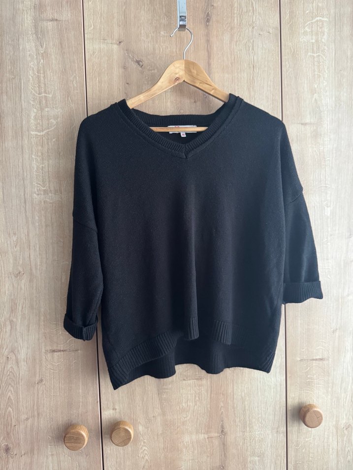 Kadın siyah akrilik kazak, V yaka ve uzun kollu, rahat kesimiyle günlük kullanım için konforlu ve şık bir görünüm sunar.