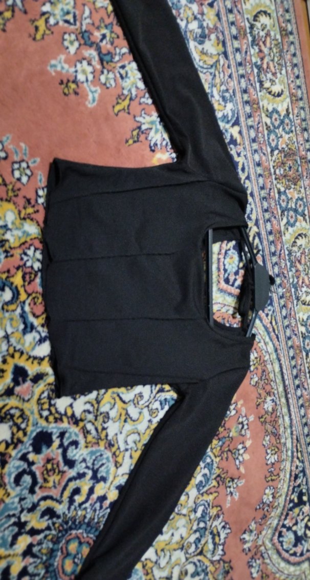 Siyah, V yaka, uzun kollu, kemerli ve oturan kesime sahip kadın bluz. Sentetik, yumuşak kumaştan üretilmiş, günlük kullanıma uygun bohem tarzda.