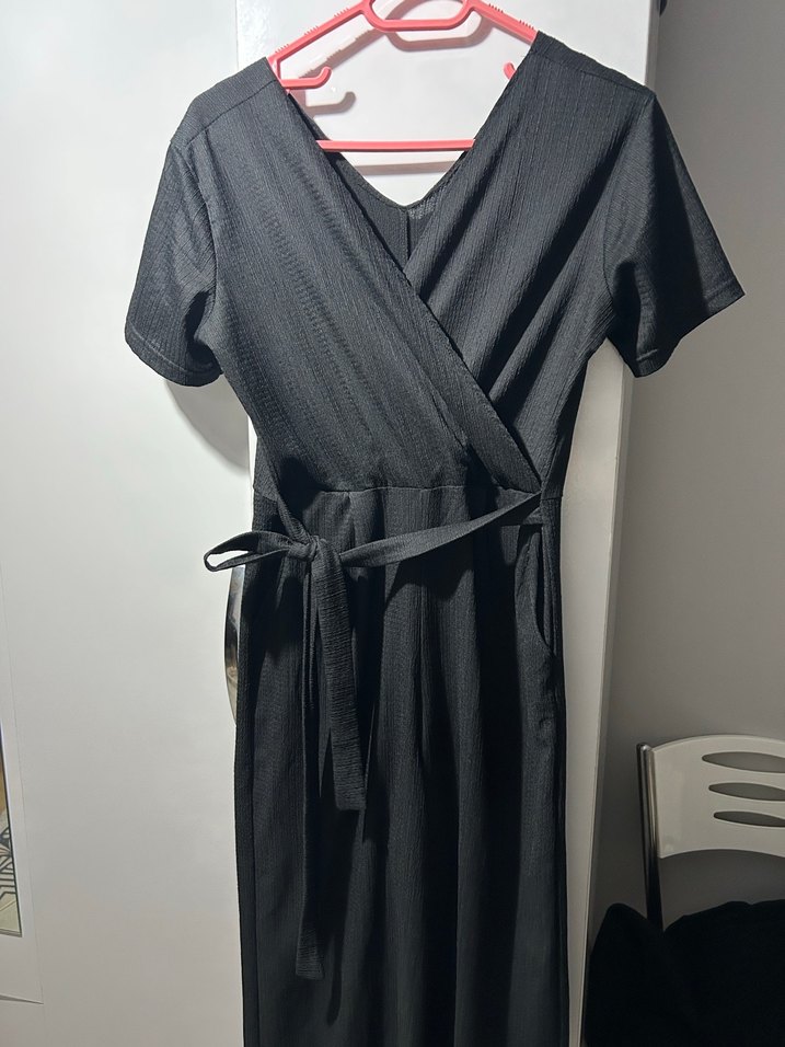 Kadınlar için v yaka, kemerli ve kısa kollu, siyah renkte sentetik kumaştan yapılmış uzun tulum. Sokak stiline uygun şık tasarım.