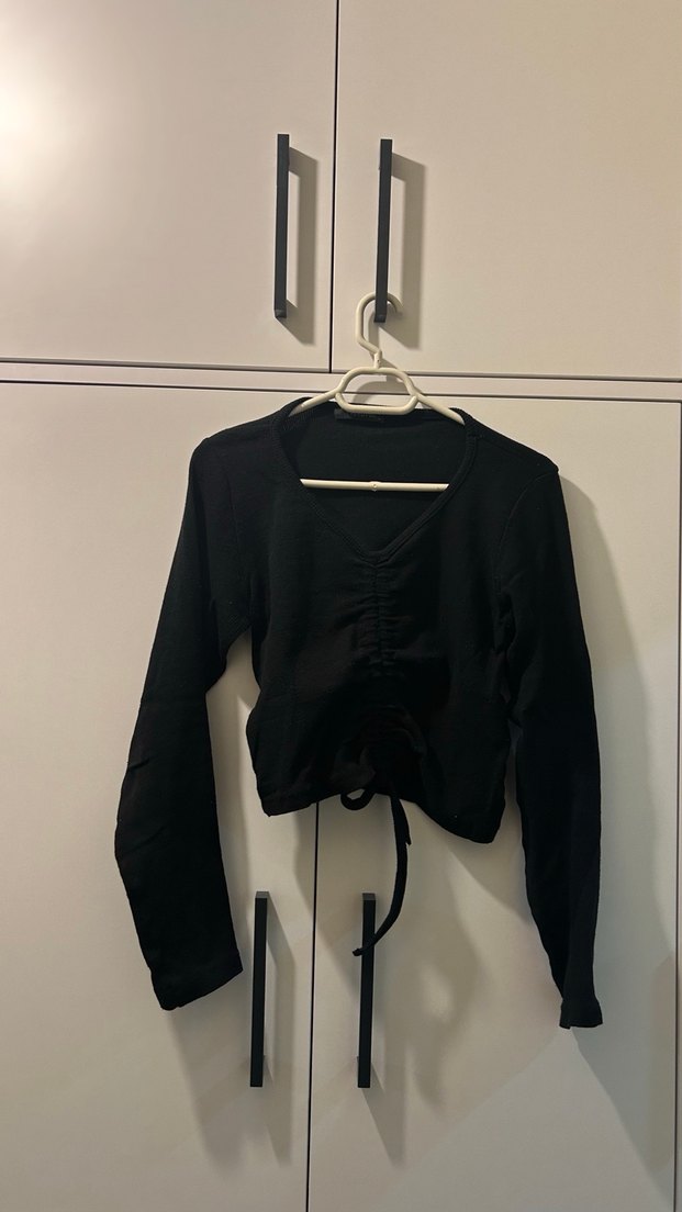 Siyah keten kumaştan, uzun kollu, V yaka, vücuda oturan kesime sahip midi boyda kadın bluz. Günlük kullanıma uygun, rahat ve şık bir tasarım.