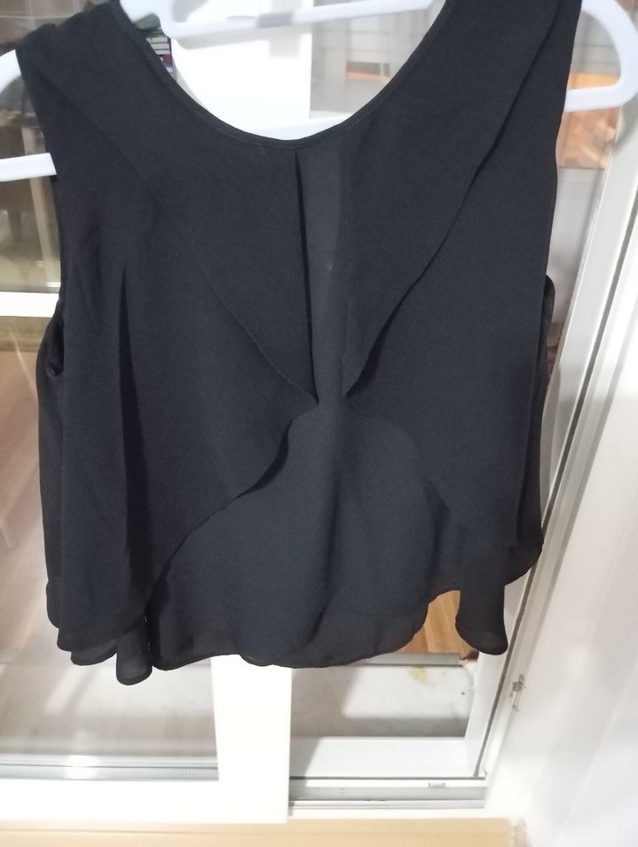 Siyah kolsuz bluz, V yaka ve fırfır detaylara sahip. Sentetik kumaştan, bol kesim ve midi boyda. Ofis için minimalist gotik tarzda uygun.