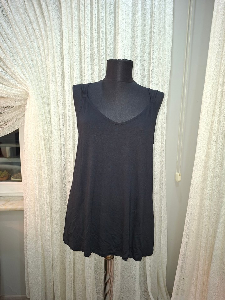 Siyah kolsuz, V yakalı, bol kesim sentetik kumaş kadın atlet. Minimalist ve goth tarzda, günlük kullanım için uygundur. Medium bedene uygundur.1 kez giyiyildi.